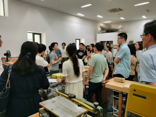 在革命丰碑展馆的红色劳动工坊,学员们对我校将红色资源保护利用融入第一课堂和第二课堂、将思政教育和劳动教育相融合的教学与实践情况进行了调研,对学生在建筑测绘、中国建筑史等课程中制作红色旧址木工实体模型的劳育实践环节产生了浓厚的兴趣,深入了解学生利用激光切割等手段设计、制作红色旧址复原模型的工艺原理和加工流程,学员代表还分组进行了沉浸式模型构件的安装体验,更加活跃了本次现场教学的气氛。通过参观学员们对进一步开展红色资源保护工作的迫切性和重要意义产生了巨大的共鸣,对探索红色资源的保护利用与高校科研与教学相结合的有效路径进行了深入思考。