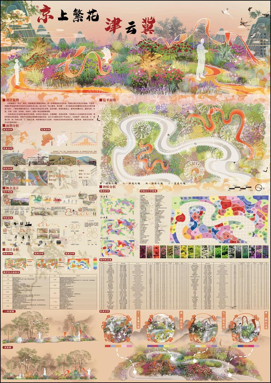 为积极践行“两山”理论,持续推进公园城市建设,进一步厚植绿色生态本底, 挖掘公园生态活力价值链,打造京津冀世界级城市群中的现代化品质生活之城。设计名叫“京上繁花,津云冀”,本方案结合京津冀特色历史文化等元素进行设计。了解京津冀京绣文化、长城文化和运河文化等,旨在创新、美观的基础上,宣传京津冀文化,提供可观、可赏、可停、可游、可体验、可参与、全新一体化游园新场景。