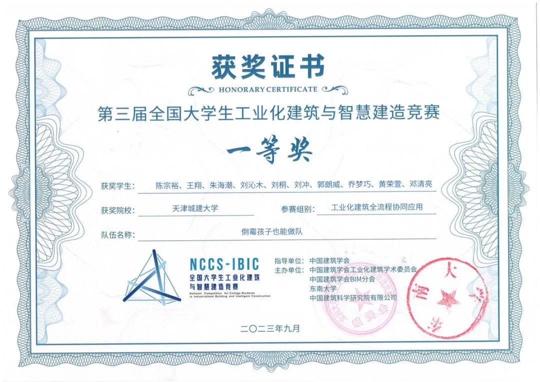 近日,在第三届全国大学生工业化建筑与智慧建造竞赛中,我院由陈宗裕、王翔、朱海潮、刘沁木、刘桐、刘冲、郭朗威、邓清亮、黄荣萱、乔梦巧等10位同学组成的参赛团队,在刘晓东、张祥智、王旭、李小娟、万达等老师指导下,斩获工业化建筑全流程协同应用赛道中的一等奖,学校荣获优秀组织奖。