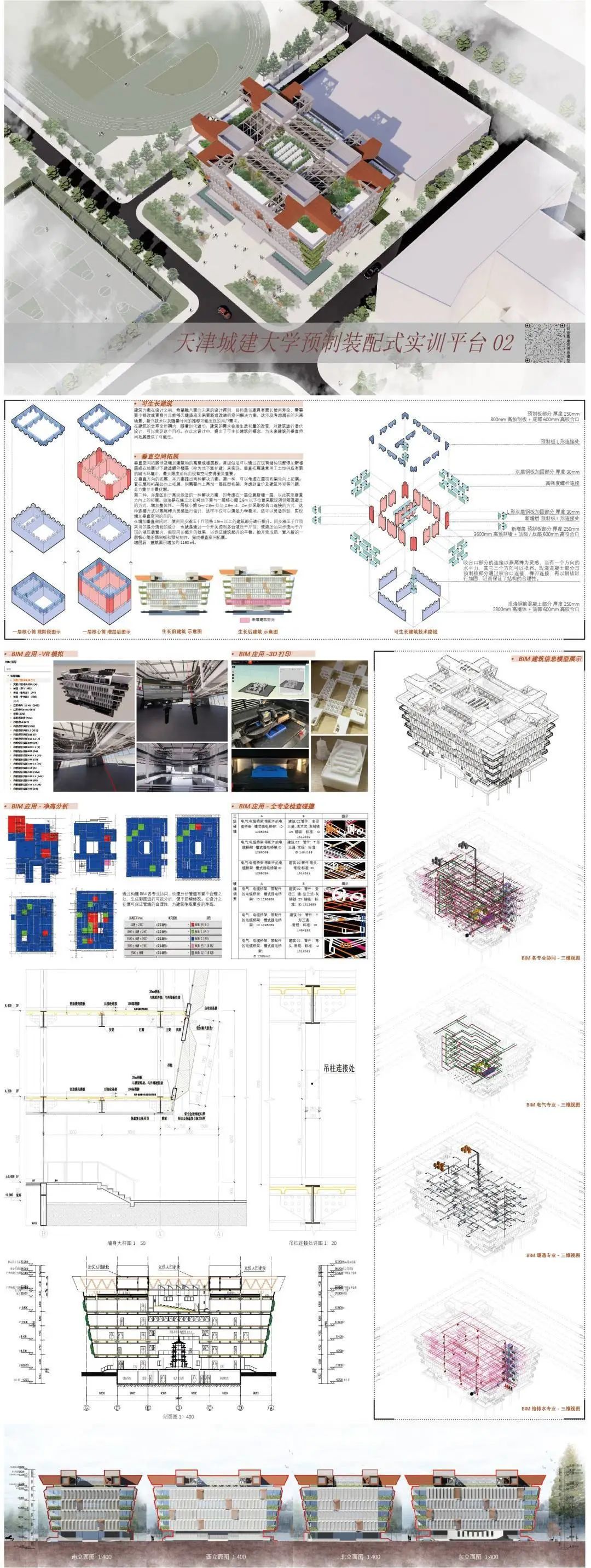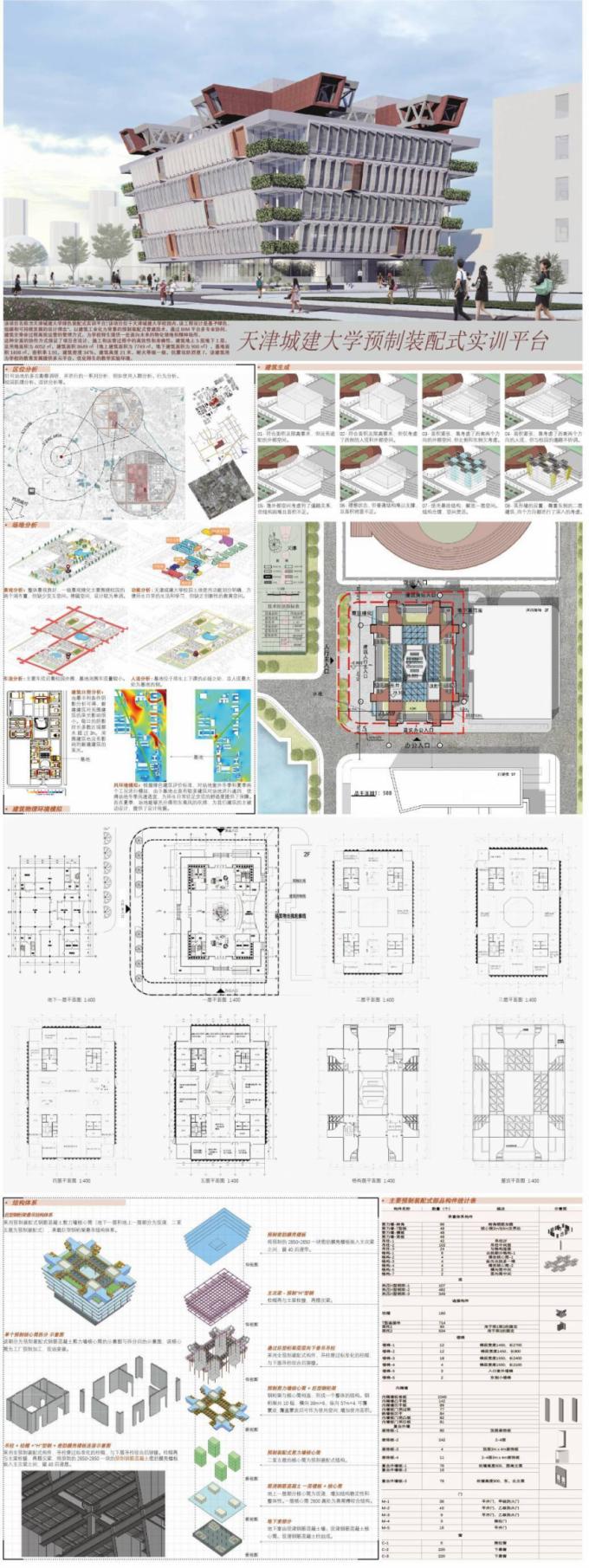我院代表队选择参加工业化建筑全流程协同应用。参赛项目《天津城建大学预制装配式实训平台》是为天津城建大学设计营建一座绿建实训平台。基地位于天津城建大学校园内。本工程设计是基于“绿色、低碳和可持续发展”的设计理念,以建筑工业化为背景的预制装配式营建技术,通过BIM平台多专业协同的、建筑全寿命过程高效运营的管理方式,为学校师生提供一处面向未来的物化领地和精神场所。经过几十次优化设计,实现了高预制率与高装配率。