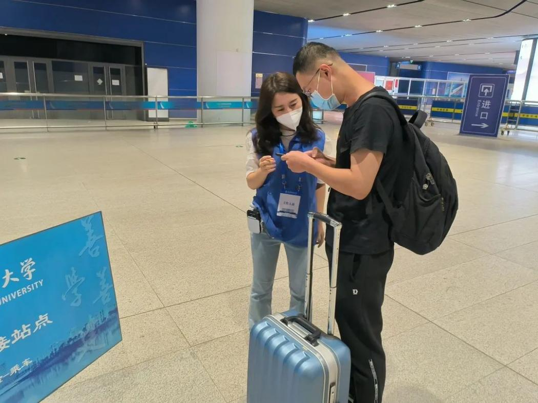 车站内设置接站点,由老师带领排队出站。出站后,站点负责人会将同学们行李进行消杀,为同学们分发替换口罩,查验、点名后上车。