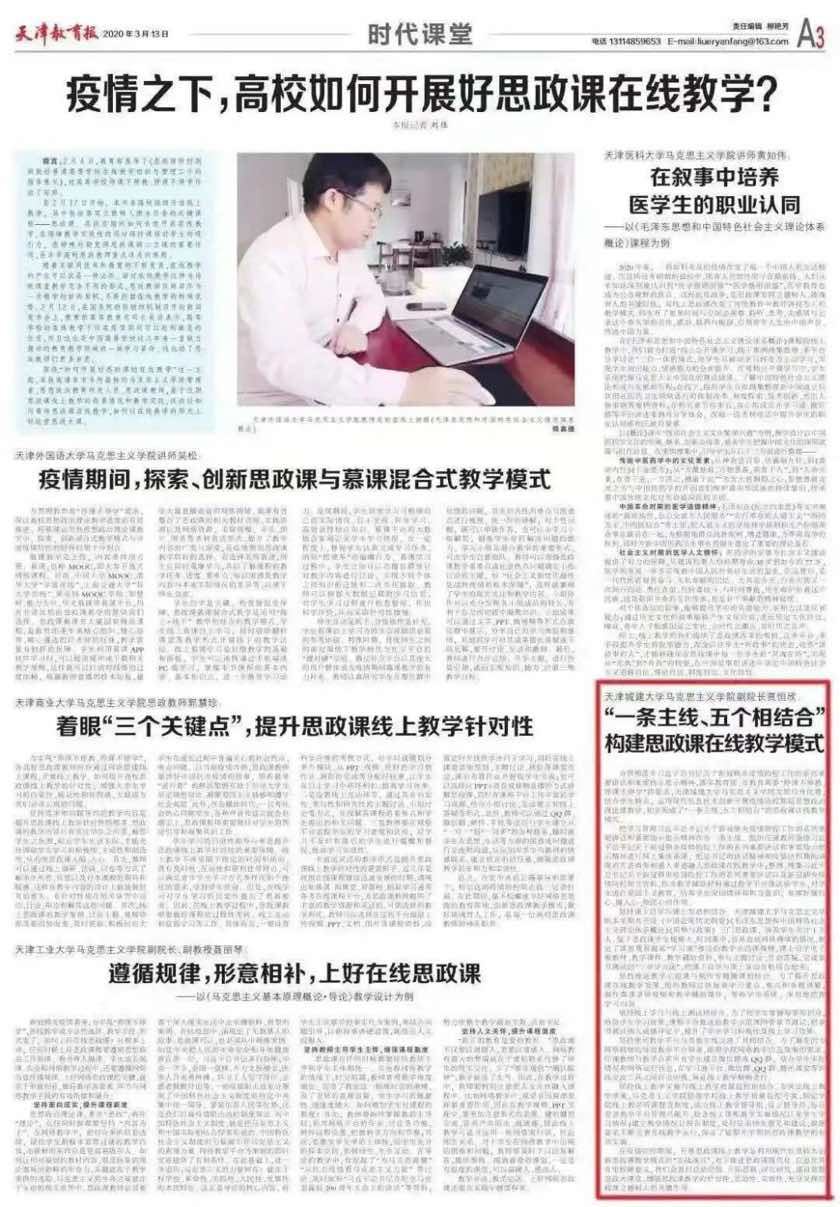 出台《天津城建大学关于深化新时代学校思想政治理论课改革创新实施方案》,打造“一条主线、五个相结合”的思政课线上教学模式,获评津门教育特色线上思政课,荣获各类思政课奖项6项。学校扎实推进“课程思政”建设,制定《天津城建大学课程育人工作实施方案》《天津城建大学“一核三环”课程育人体系建设方案》等文件,强化3门天津市“课程思政”示范课程建设,立项校级课程思政示范课63门,推出16门研究生课程思政改革项目。