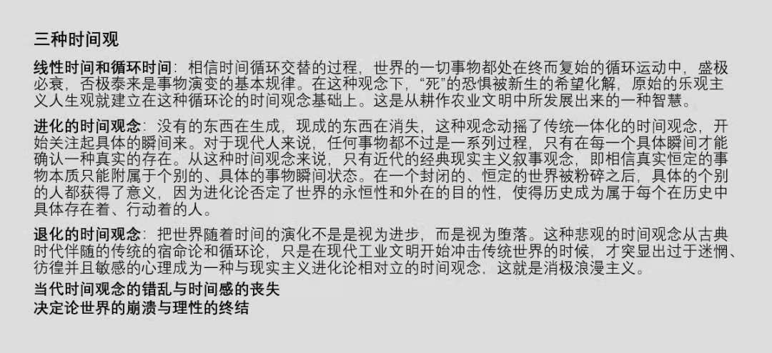 通过对时间得更深一层的挖掘,我们认识三种不同时间观念,而第一种线性的循环时间与我们的观念相符,这种循环的时间观念使得我们面对未来如当下一般,与此同时我们引入VUCA(乌卡)时代这一概念,即volatile (易变)、uncertain (不确定)、complex (复杂)、ambiguous (模糊),乌卡时代是一个具有现代概念的词,是指我们当下的世界正是一个易变、不确定、复杂、模糊的时代,在这样时代,人们以往的安稳与平和已经越来越难有空间,人类的迷茫、无助、指责等等似乎成为当下无法避开的话题,但是我们认为,即使在这样的VUCA(乌卡)时代,也无法阻挡历史的车轮滚滚向前,也无法阻止历史的循环,当下并不是永恒。这也是我们对时间、对当下、对未来的认识。